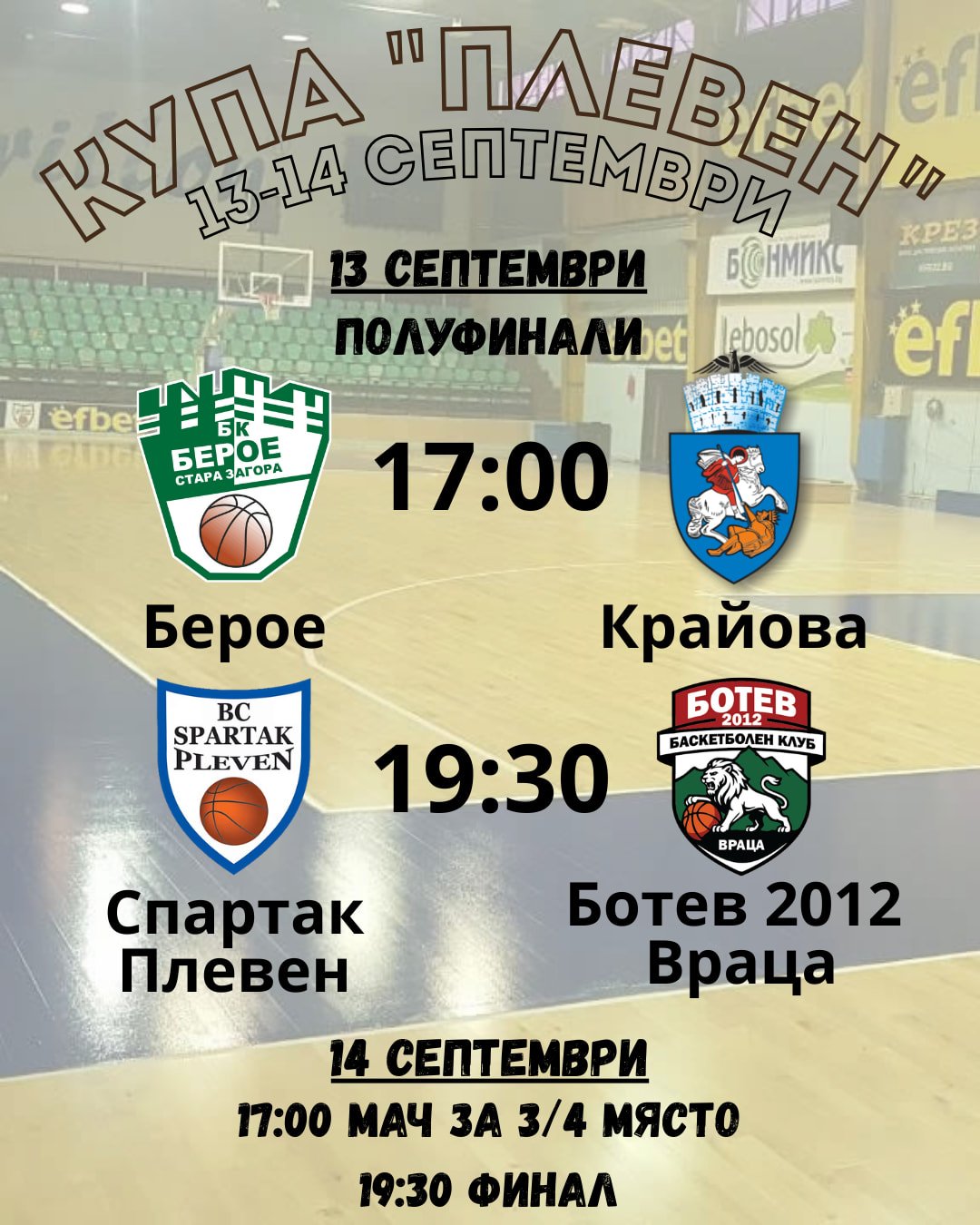 През уикенда в Плевен ще се проведе приятелски баскетболен турнир с участието на Берое, домакина Спартак, Ботев Враца и Крайова.