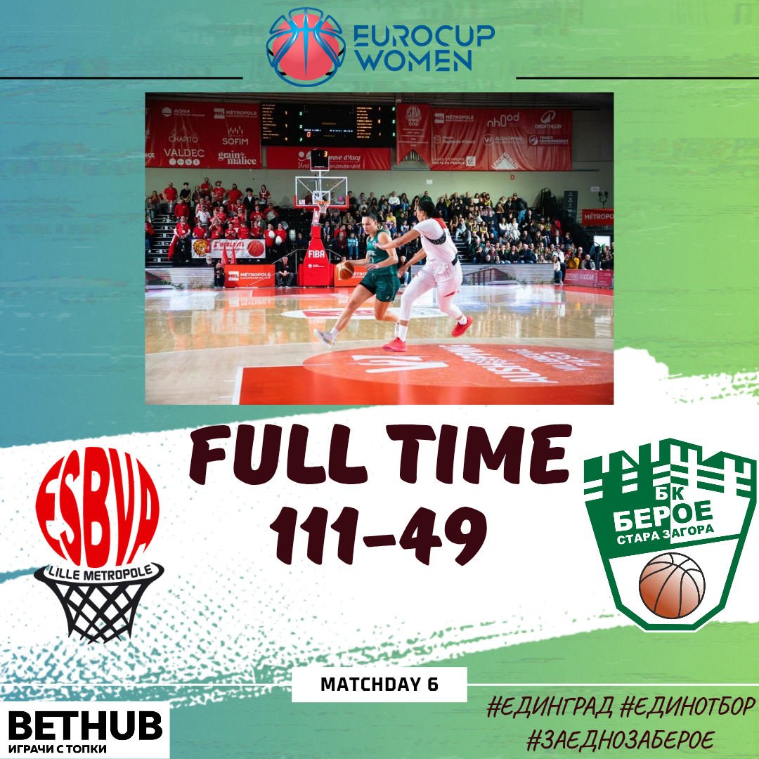Дамският баскетболен тим на Берое приключи с катастрофална загуба при 49:111, двубоя си с френския АСБ Виланьов Д′Аск. В последния си мач вицешампионките на България не успяха да се противопоставят на своя съперник и завършиха с 0 в графата победи в своята група. Точковата разлика в 6-те мача пък е минус 160, което средно пасив минус 25 точки на мач.