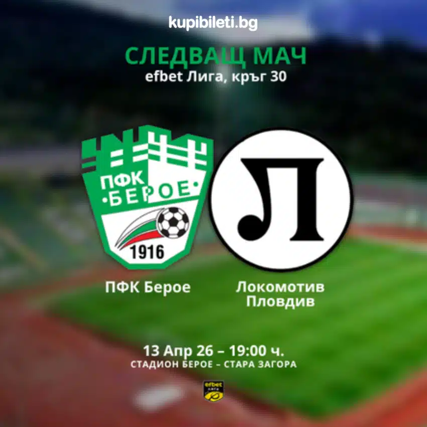 ПФК Берое пусна в продажба билетите за мача срещу ПФК Локомотив Пловдив. Срещата между ПФК Берое и ПФК Локомотив Пловдив ще се проведе на 13 април 2026 г. от 19:00 ч. на стадион „Берое“ в Стара Загора. Двубоят е част от 30-ия кръг на Първа лига. Цената на билета за мача е 10 евро. Билетите за VIP зоната струват 25,50 евро в предварителна продажба и в деня на мача.