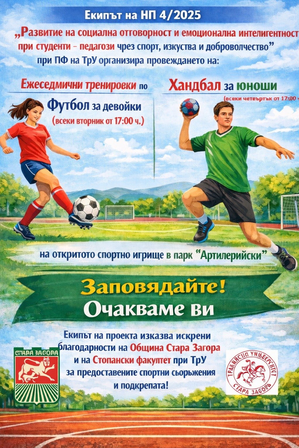Екипът на НП 4/2025 „Развитие на социална отговорност и емоционална интелигентност при студенти – педагози чрез спорт, изкуства и доброволчество“ към ПФ на ТрУ ви кани да се включите в нашите ежеседмични спортни активности: