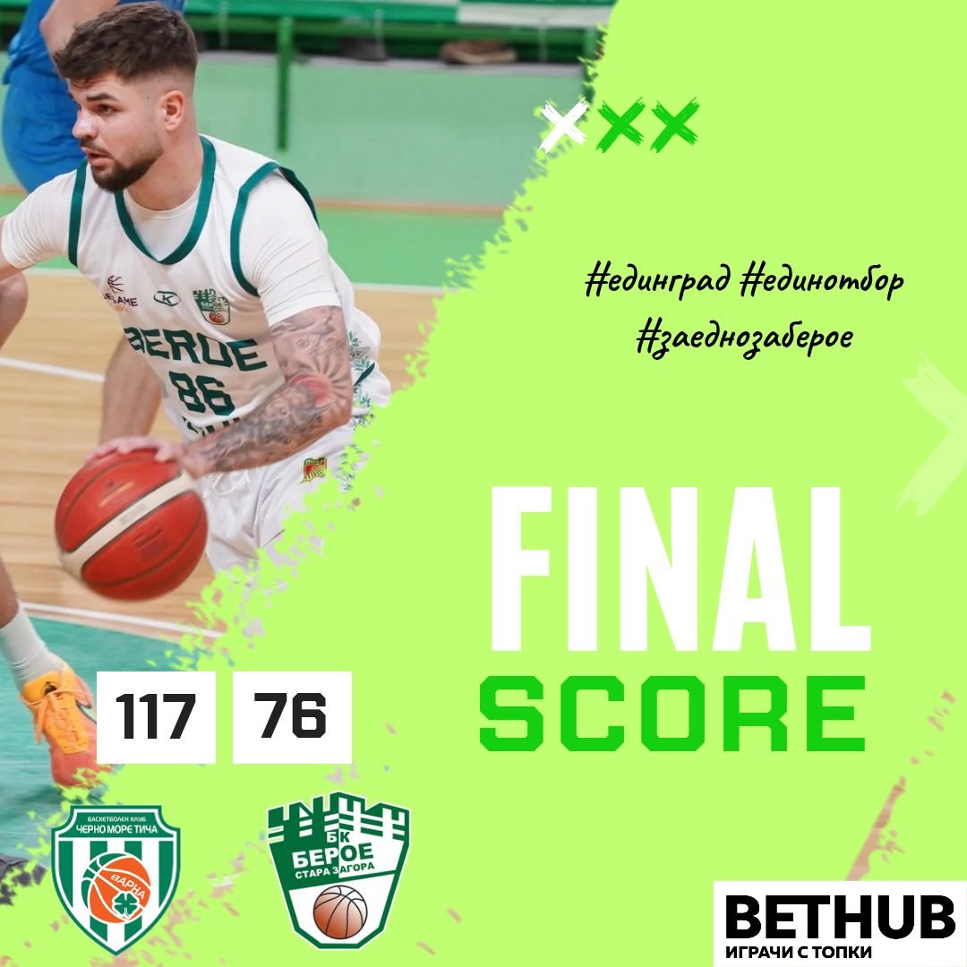 Черно море Тича спечели по безапелационен начин последното си домакинство от редовния сезон в НБЛ. Носителят на Купата на България надигра Берое със 117:76 в своята зала „Христо Борисов“ и си осигури третото място преди последния си мач – гостуване на Шумен в заключителния, 33-и кръг.